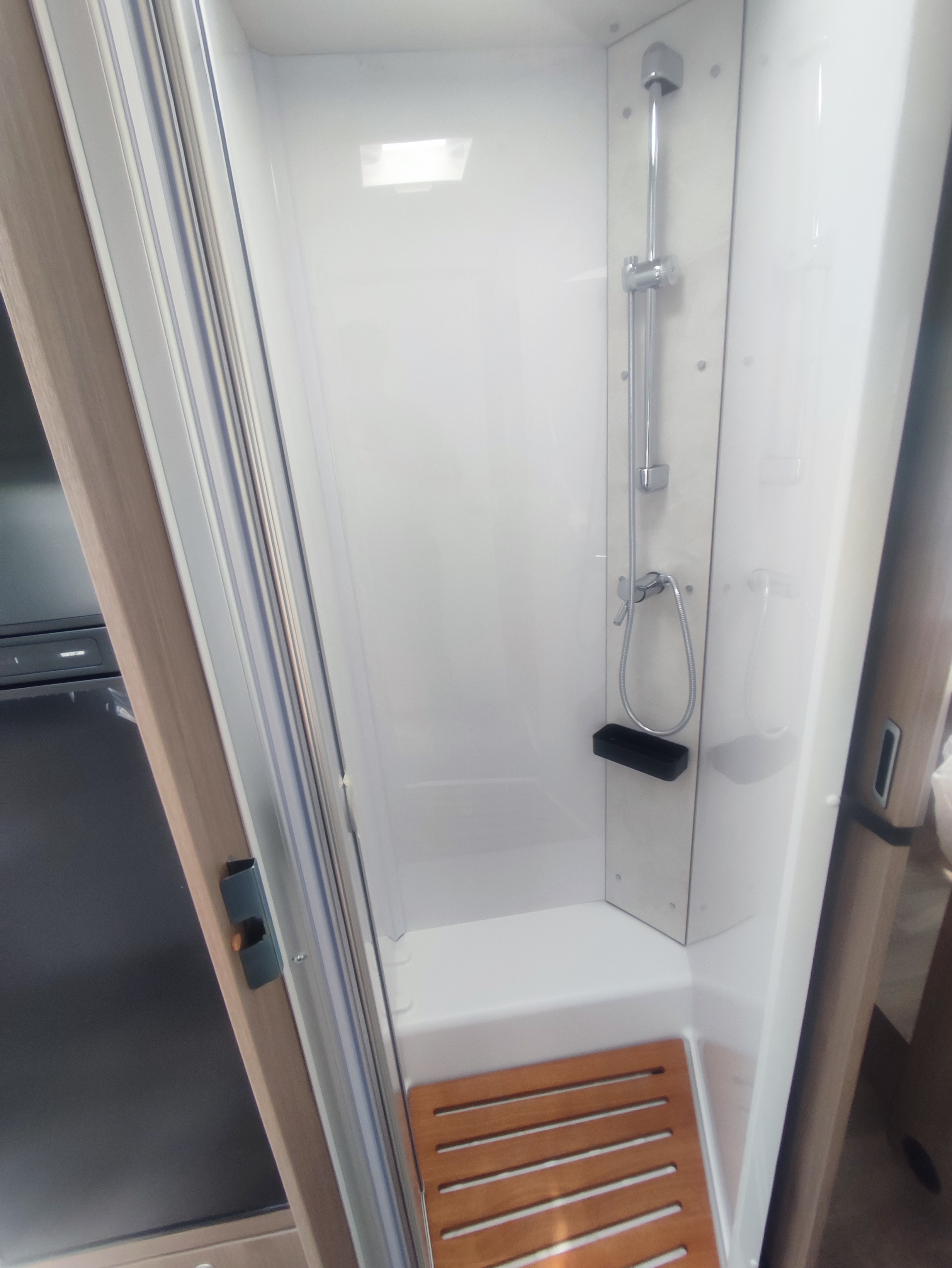 Option incluses : *PACK CONFORT, Climatisation cabine, Fermeture centralisée, Rallonge pivotante de table, Large marche pied éléctrique, Equipement de douche Lanterneau panoramique + Porte moustiquaire*, soute double accés, couleur exterieur blanc glacier,