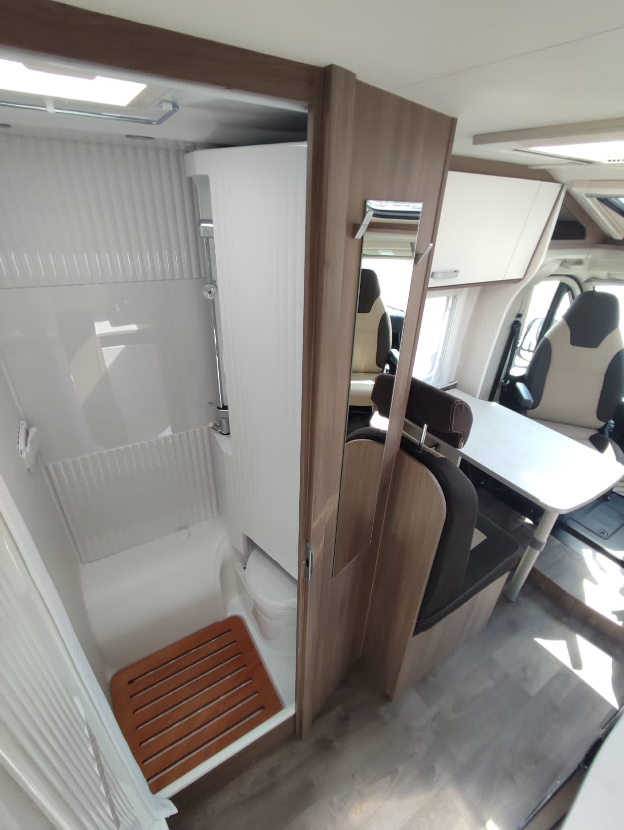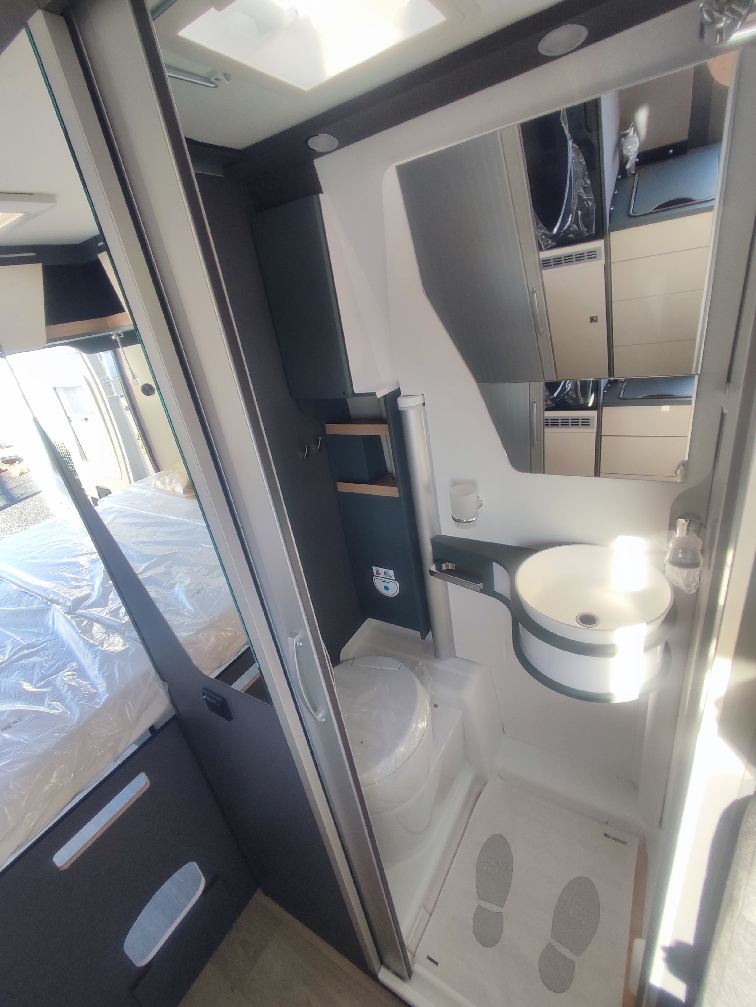 Option incluses : Boite automatique 8 rapports, Précablage caméra de recul, Pack pro+, Ambiance sellerie ICE, Climatisation cabine, , Rallonge pivotante de table, Large marche pied électrique, Equipement de douche Lanterneau panoramique ouvrant , Porte moustiquaire, soute double accès, couleur extérieur blanc glacier + Peinture cabine gris métalisé.